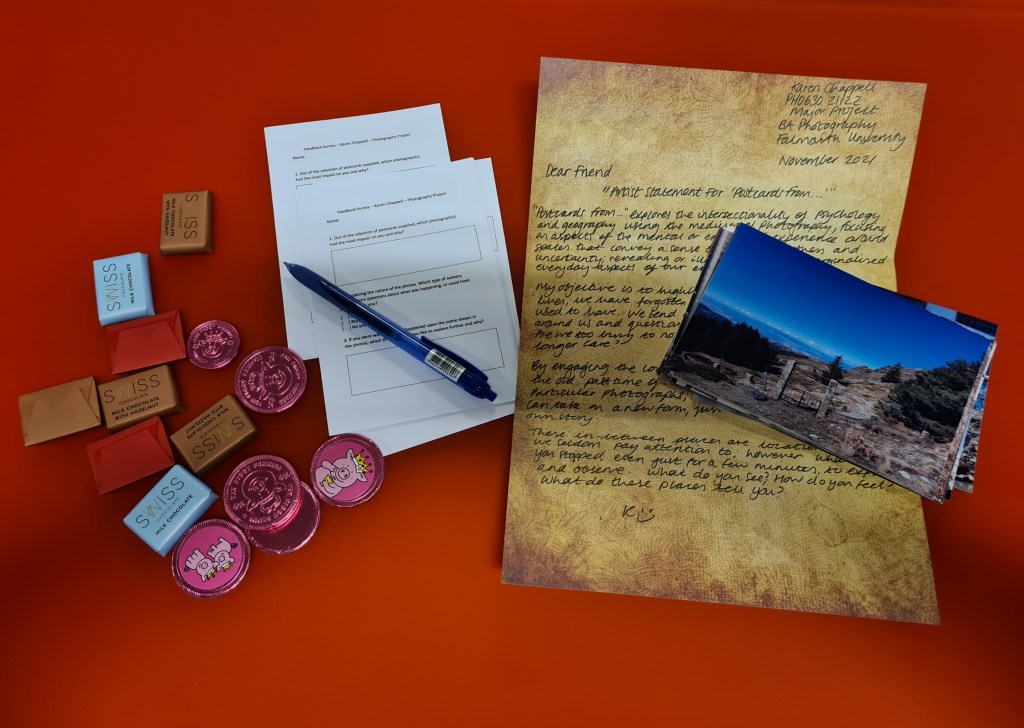 The images / postcards are to be viewed in no particular order as each one should be strong enough to stand on it’s own; you as the viewer can decide which order you’d like to view them in. However, the order shown in the video is my preference and simply because I had to have the images in a sequence to “hand in” the project.